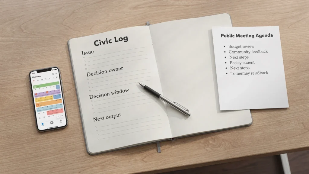 Create a simple “Civic Log.” A notes app, a spreadsheet, or a paper notebook works. You only need four fields: