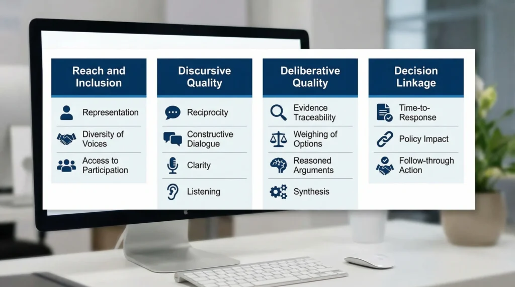 If your goal is healthier public decisions, you need to measure what happens between “people showed up” and “a decision was made.” That gap is exactly where discursive democracy (the quality of public talk) and deliberative democracy (the quality of public reasoning toward options) either strengthen legitimacy or quietly fail.