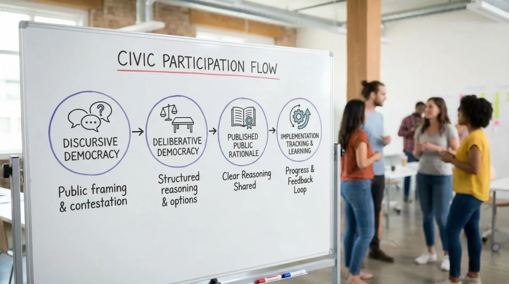 This matters because, long before any formal deliberation begins, the public sphere has already decided what is “normal,” what is “extreme,” what is “practical,” and what is “naive.” Discursive democracy tries to make that arena more plural, more contestable, and more inclusive.