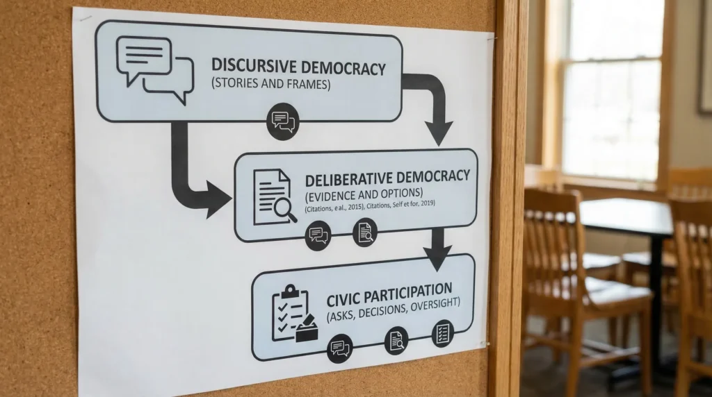 What’s the difference between discursive democracy and deliberative democracy in practice? Discursive democracy is the open public sphere where issues and frames emerge. Deliberative democracy is a structured process that turns those inputs into evidence-informed options and reasons that can guide decisions.
