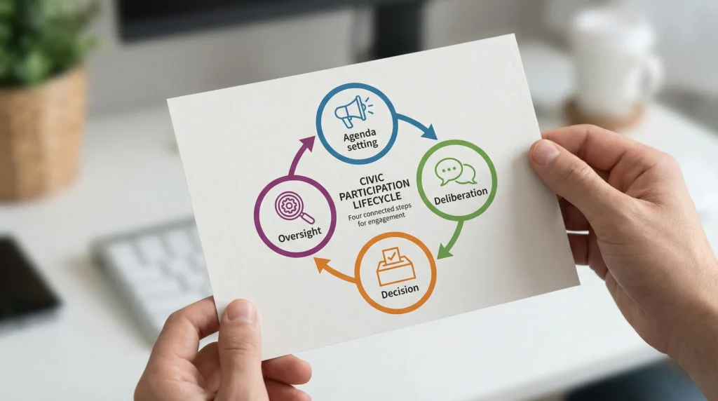 Below are 10 types of civic participation you can choose from, depending on your time, risk tolerance, and the kind of impact you want. The goal is not to do all of them. The goal is to pick one that is sustainable, legitimate, and connected to real decisions.